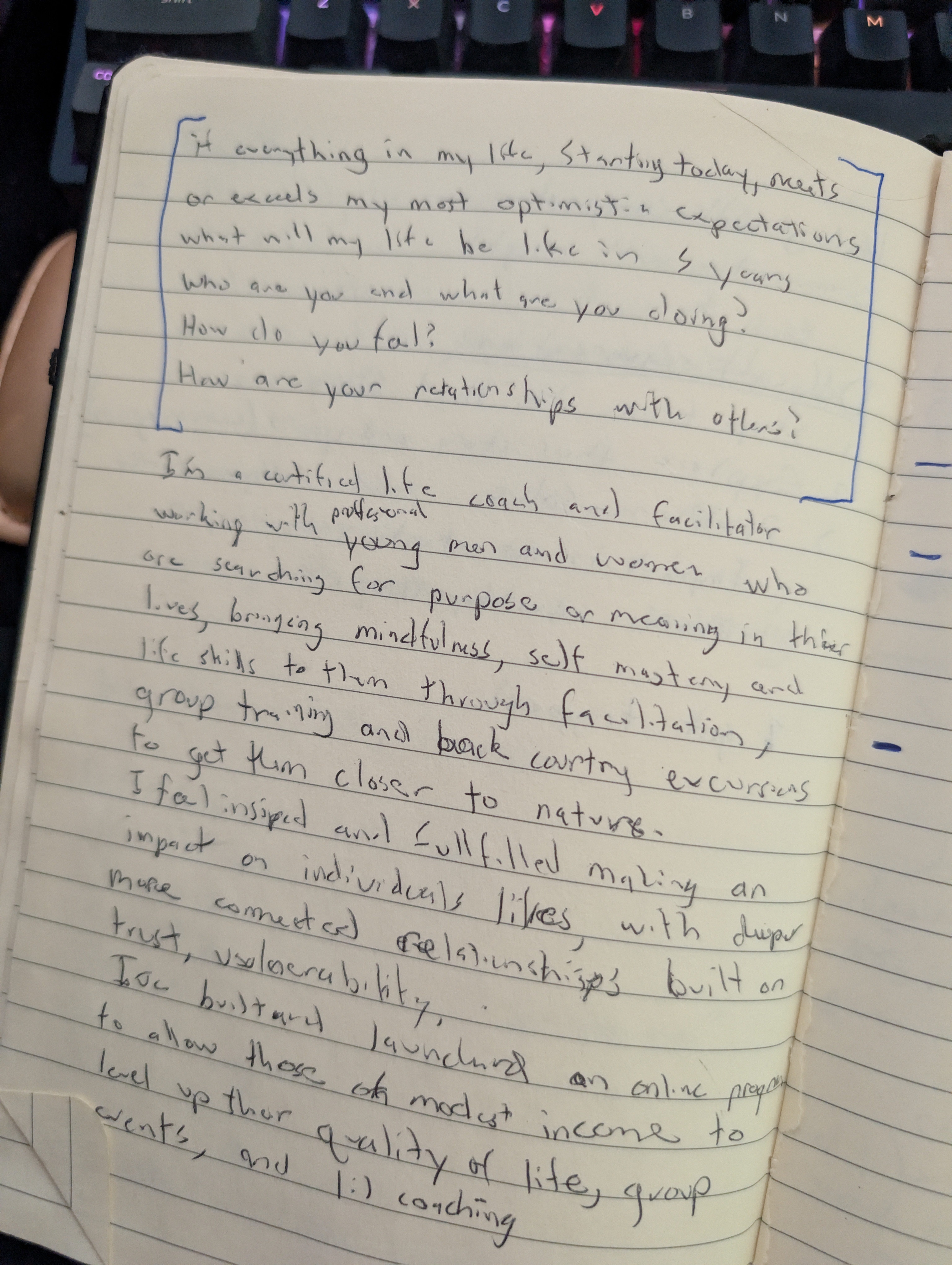 In the days after I was laid off, I ritually burned my other work notebooks filled with OKRs, quarterly plans, and performance metrics. When I reached for a fresh notebook to start my next chapter, I found that old one from the workshop. There was the prompt…and my reply.